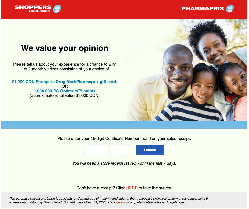I’ve been a regular at Shoppers Drug Mart for years, and after a recent visit, I spotted a note at the bottom of my receipt. It said I could take a short survey at SurveySDM.com for a chance to win either a $1,000 Shoppers gift card or 1,000,000 PC Optimum™ points.